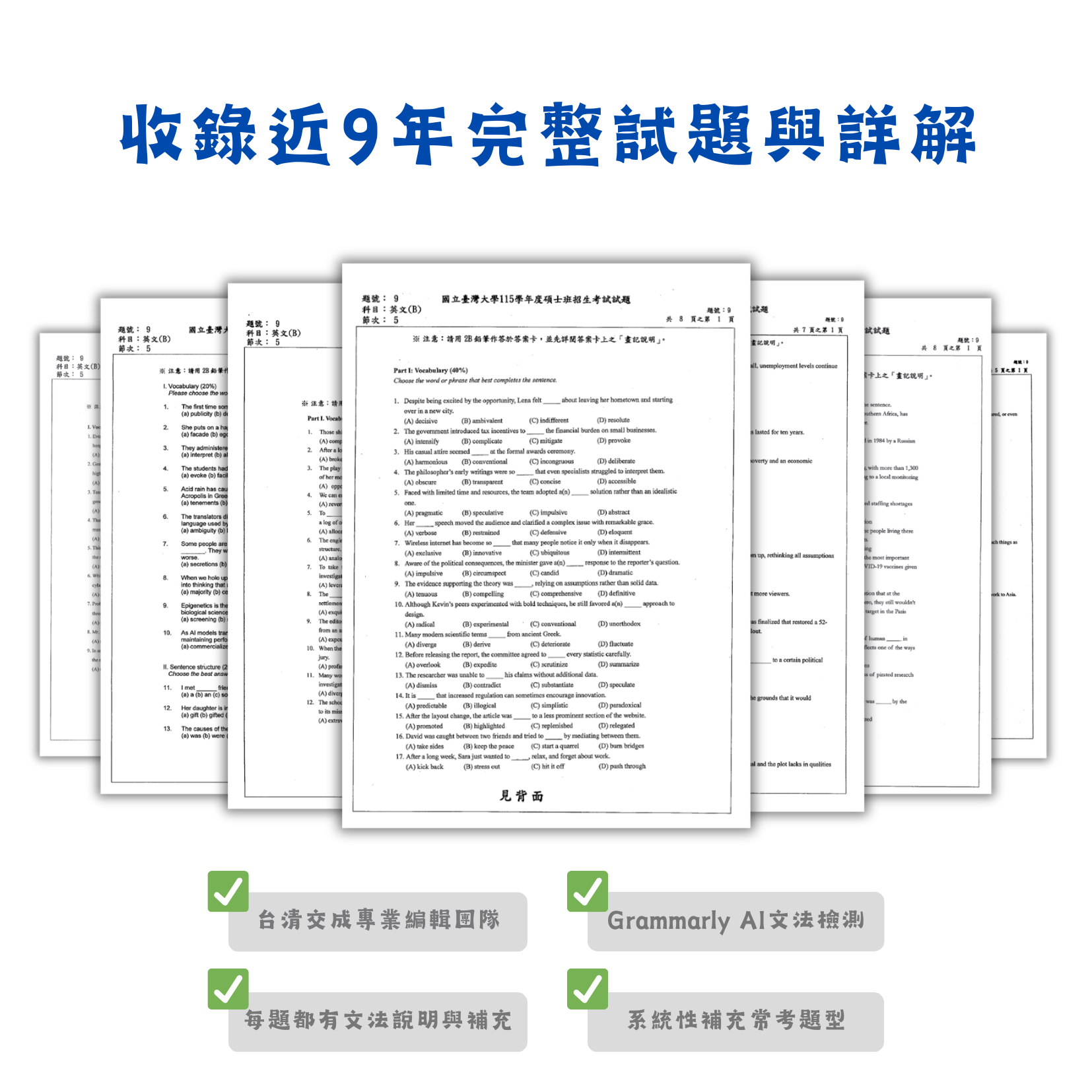 首頁/研究所英文歷屆詳解/[電子檔] 台大A/B英文歷屆試題詳解 11% OFF [電子檔] 台大A/B英文歷屆試題詳解NT$280 原始價格:NT$280。NT$250目前價格:NT$250。 台大研究所考試英文107~115歷屆試題&詳解(A卷+B卷) 電子檔內容:試題、詳解、單字彙整 [電子檔] 台大A/B英文歷屆試題詳解 數量 加入購物車 分類: 研究所英文歷屆詳解 標籤: 研究所考試, 考古題, 英文詳解 描述 評價 (0) 描述 商品評價 目前沒有評價。 搶先評價 “[電子檔] 台大A/B英文歷屆試題詳解”取消回覆發佈留言必須填寫的電子郵件地址不會公開。 必填欄位標示為 *您的評分 * 評分… 完美 很好 一般 不錯 很差 名稱 *電子郵件 *您的評價 * 在瀏覽器中儲存顯示名稱、電子郵件地址及個人網站網址,以供下次發佈留言時使用。 送出 相關商品 11% OFF [電子檔] 政大A/B英文歷屆試題詳解 NT$280 原始價格:NT$280。NT$250目前價格:NT$250。 研究所英文歷屆詳解加入購物車 11% OFF [電子檔] 各校高頻率單字表 NT$280 原始價格:NT$280。NT$250目前價格:NT$250。 高頻單字表 | 文法整理加入購物車 特價 [電子檔] 各校研究所英文歷屆試題 NT$250 研究所英文歷屆詳解查看商品